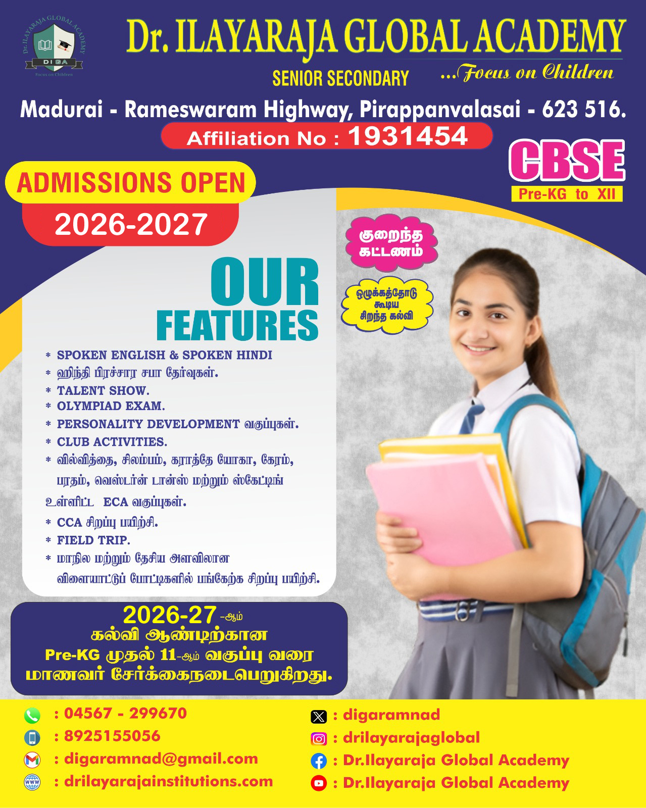 The core purpose of education is to provide children with a learning environment which brings out the best in them. We believe that every child is endowed with a unique set of attributes and abilities, which need to be nurtured so that they blossom. Therefore, every child deserves an education that enrich academic excellence and all-round development, and ensures their well-being. We are inspired by these tenets in everything that we do at ilayaraja Global Academy (DIGA). At DIGA, our overarching goal has been to make DIGA a happy school, where teaching is a pleasure and learning is a joy; where learning and excelling is a passion, and culture and values have a pre-eminent place. I am confident that DIGA will play a vital role of educational leadership in the state of Tamilnadu in near future. My heartfelt wishes are always with my worthy scholar pupils.