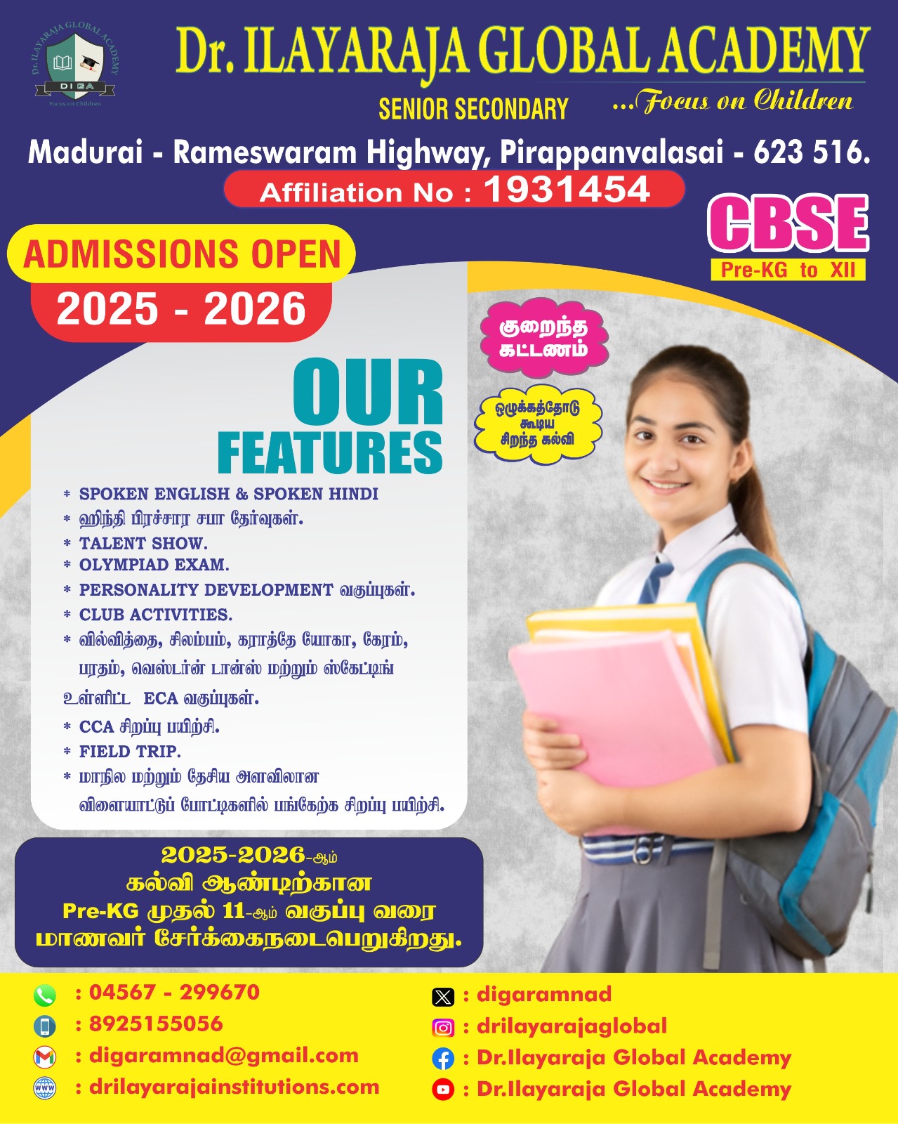 The core purpose of education is to provide children with a learning environment which brings out the best in them. We believe that every child is endowed with a unique set of attributes and abilities, which need to be nurtured so that they blossom. Therefore, every child deserves an education that enrich academic excellence and all-round development, and ensures their well-being. We are inspired by these tenets in everything that we do at ilayaraja Global Academy (DIGA). At DIGA, our overarching goal has been to make DIGA a happy school, where teaching is a pleasure and learning is a joy; where learning and excelling is a passion, and culture and values have a pre-eminent place. I am confident that DIGA will play a vital role of educational leadership in the state of Tamilnadu in near future. My heartfelt wishes are always with my worthy scholar pupils.